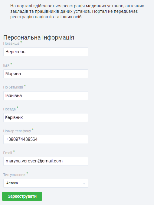 Для реєстрації необхідні такі особисті дані керівника аптечного закладу:
