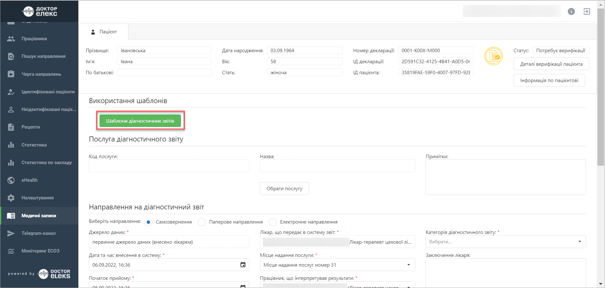 - Увійдіть на вебпортал Doctor Eleks і в бічному меню перейдіть на вкладку Медичні записи.